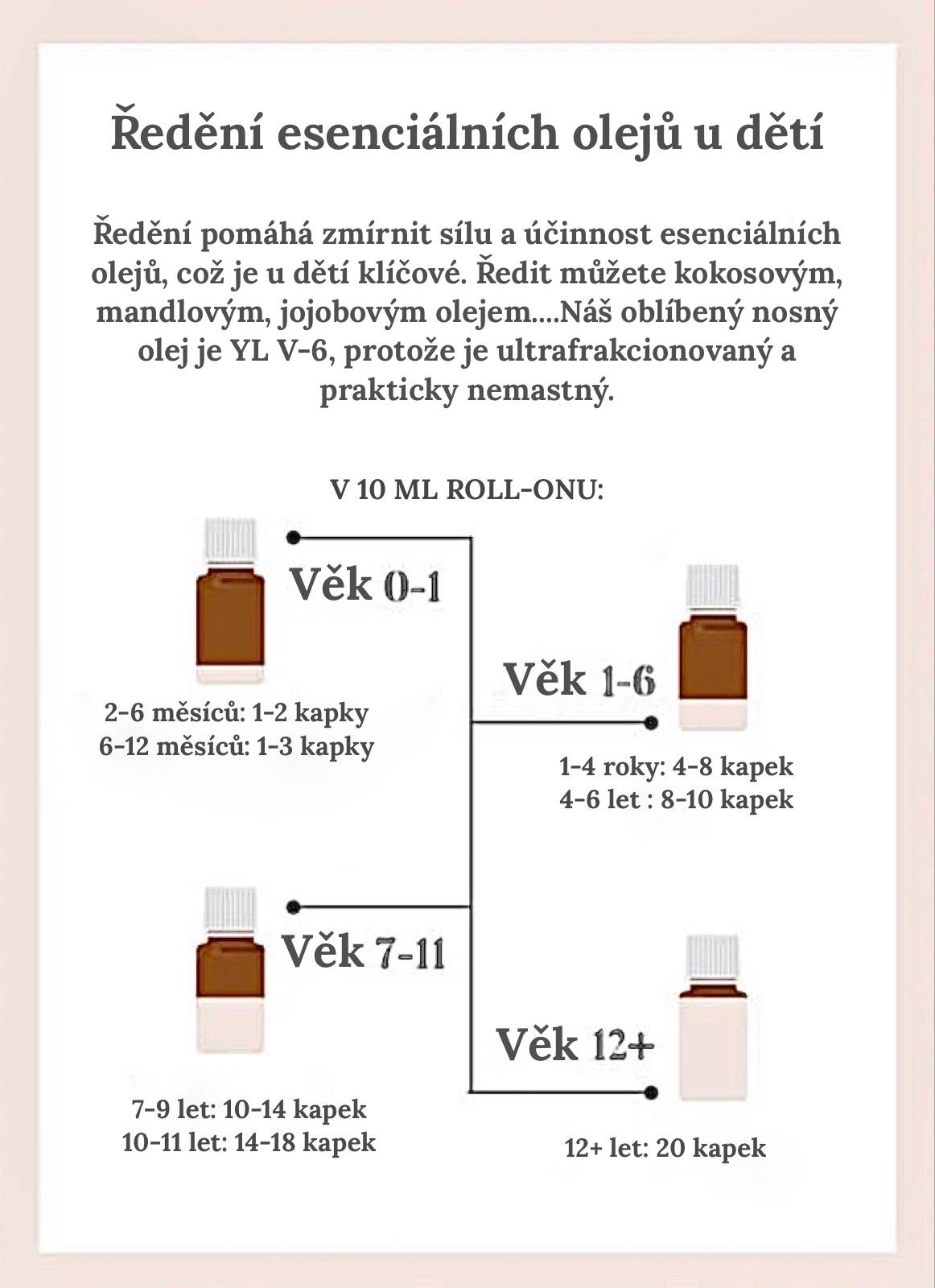 - Pokud používáte oleje na kůži u dětí, řeďte je podle věku s V6 nebo jiným nosným olejem.